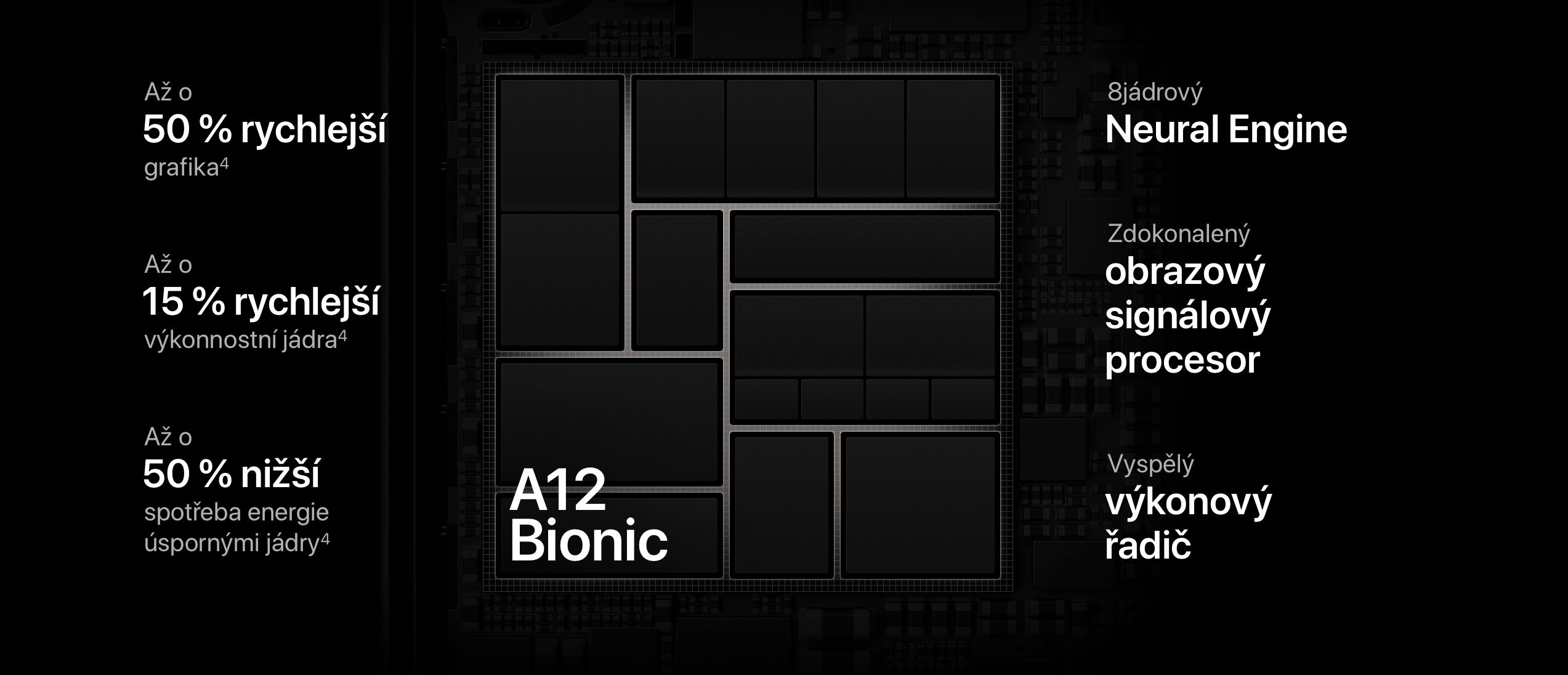 Inteligentní čip A12 Bionic. Tohle je nejchytřejší a nejvýkonnější čip ve smartphonu, s naším Neural Enginem další generace. Přináší působivé zážitky v rozšířené realitě. Fantastické portréty s ovládáním hloubky ostrosti. A rychlost a plynulost ve všem, co děláš.